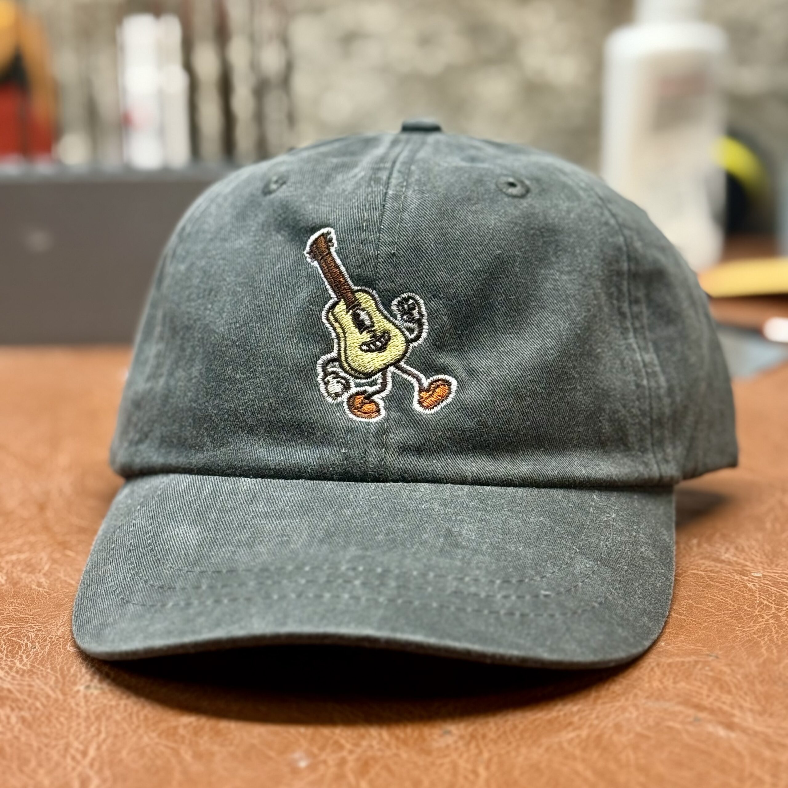At long last, the ultimate accessory for your noggin: the Bridge City Guitar dad hat. These hats are Adams LP101 caps, available in Spruce Green and Charcoal. These are the real deal, not the usual cheapo brand hats you get at a trade show booth. Leather adjustment strap, breathable mesh lining, pigment dyed, the works. These feel like your favorite, broken-in hat right out of the box!